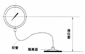 軟管連接的隔膜壓力表在安裝時若受壓部與壓力儀表處不同位置,其液位差將形成一個壓力差△P的影響,△P=密封液比重X液位差